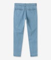 緯糸に極細のマイクロポリエステルと麻を混紡した糸を使用し、肌面の汗や湿度をしっかり吸収。その後、経糸の綿で外へ発散することで、優れた吸汗速乾性を発揮する高機能素材。まさに夏向けのデニム素材で、暑い季節でも快適に過ごせる一着。