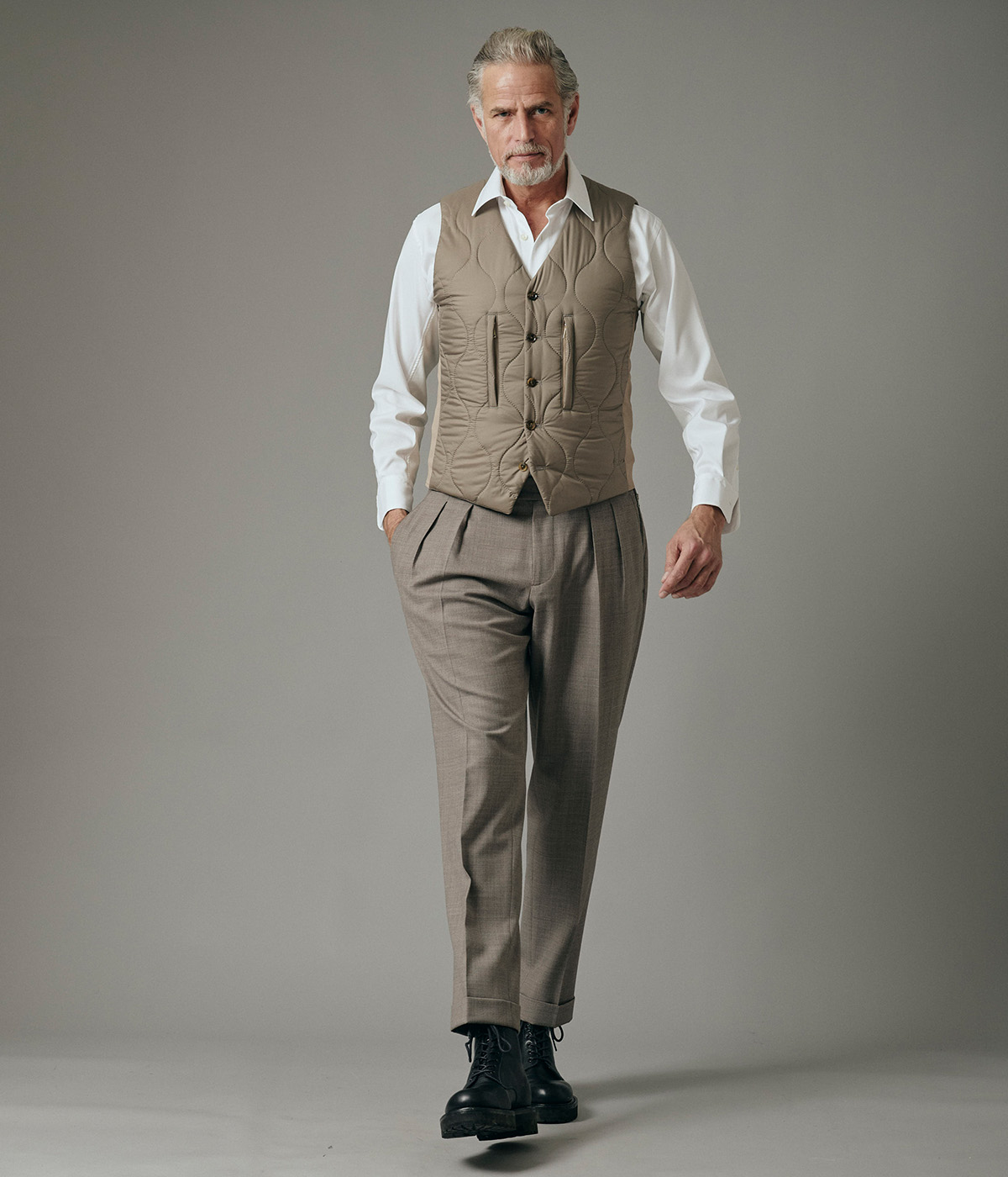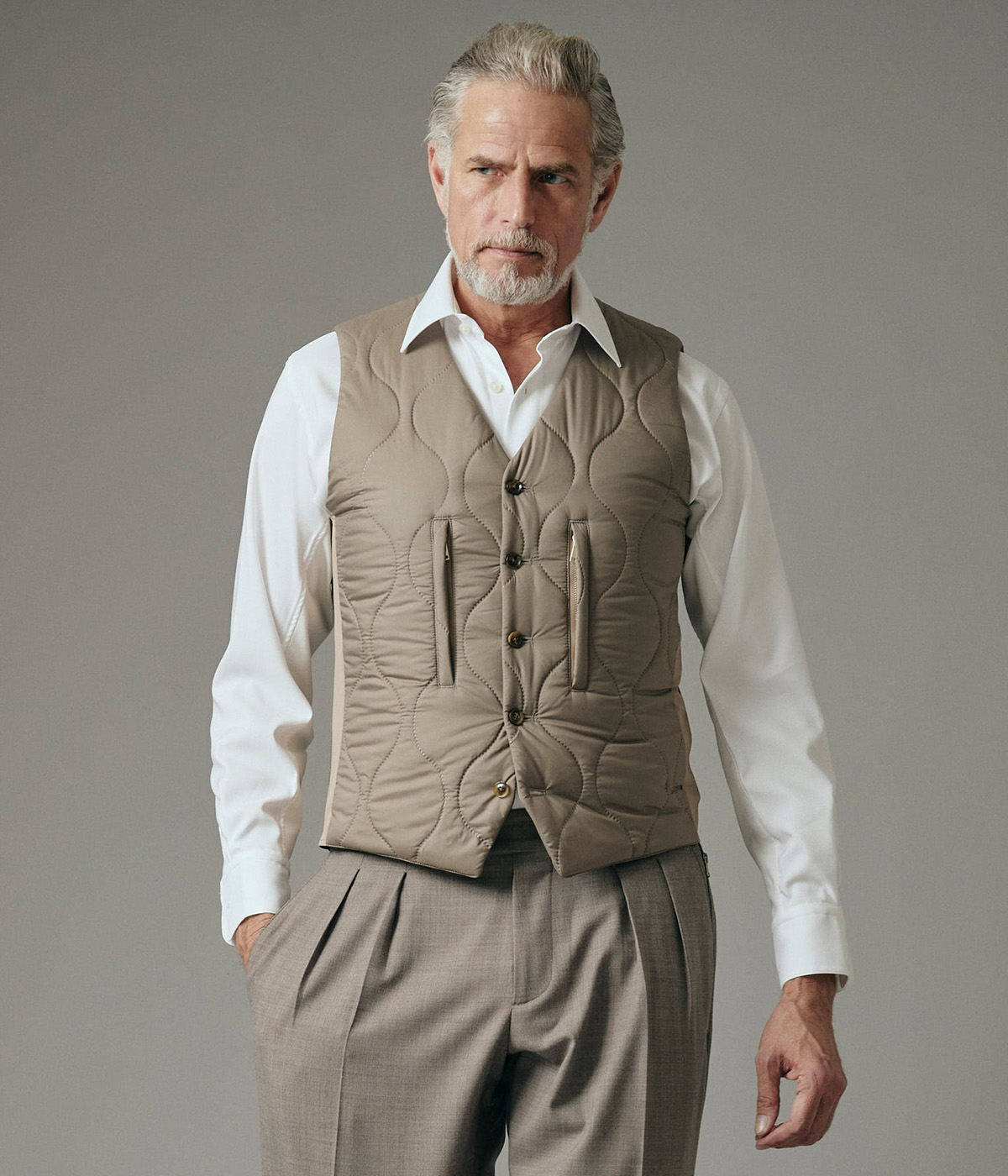 • カジュアルにもフォーマルにも対応する中綿入りの万能ベスト