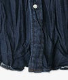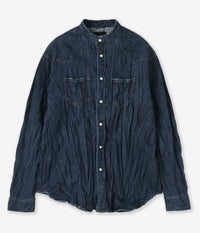 ヴィンテージ感とモダンなエッセンスを融合させた新作バンドカラーシャツで、リラックスしたサイズ感が今の気分に寄り添う一枚です。 デニム素材にバイオウォッシュ加工を施し、自然なシワ感と削りで程よいユーズド感を表現。丈夫さと軽やかさを兼ね備え、着込むほどに味わいが増していく仕上がりになっています。 ゆったりとしたシルエットはトレンド感をプラスしつつ、パールボタンや肩の共布使いでウエスタン調のアクセントを添えています。羽織りとしても一枚着としても映え、カジュアルからきれいめまで幅広く対応できる大人のデニムシャツです。