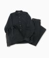デザイン面では、Shirt x Sweatのデザインを融合させることで、リラックスした表情ながら、光沢のある素材と胸元のボタンが大人な男性を演出。 パンツはポケットもついているのでホテルのキーや財布、カードなども入れることができます。腰回りは1TUCKを施し、ゆとりを感じさせながら、膝下から急激にテーパードをかけるjunhahsimotoが得意とするオリジナルパターン。 パジャマでありつつもお洒落ができる、究極の10マイルウェアに仕上がっております。