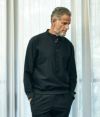 トップスは、Shirt x Sweatを融合させた、一見シンプルに見えて拘りが詰まったデザイン。トップボタンをあえて取り付けず、抜け感をアピール。また袖と裾はリブ仕様に施すことで、リラックス感のあるシルエットをだらしなく見せないデザイン。