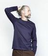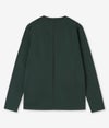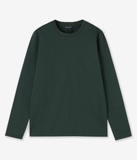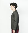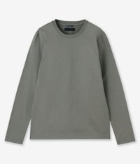 細い番手の糸で通常のカットソーに利用される糸の約3倍の長さを贅沢に使用し、 度詰して編み上げられているのでゴリゴリせず、 滑らかな肌触りとハリが特徴的。