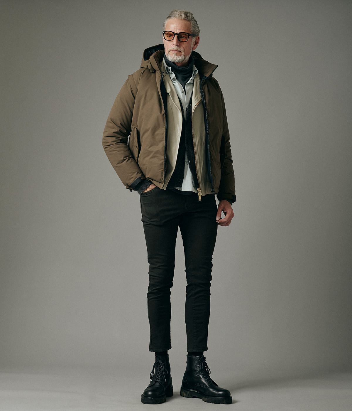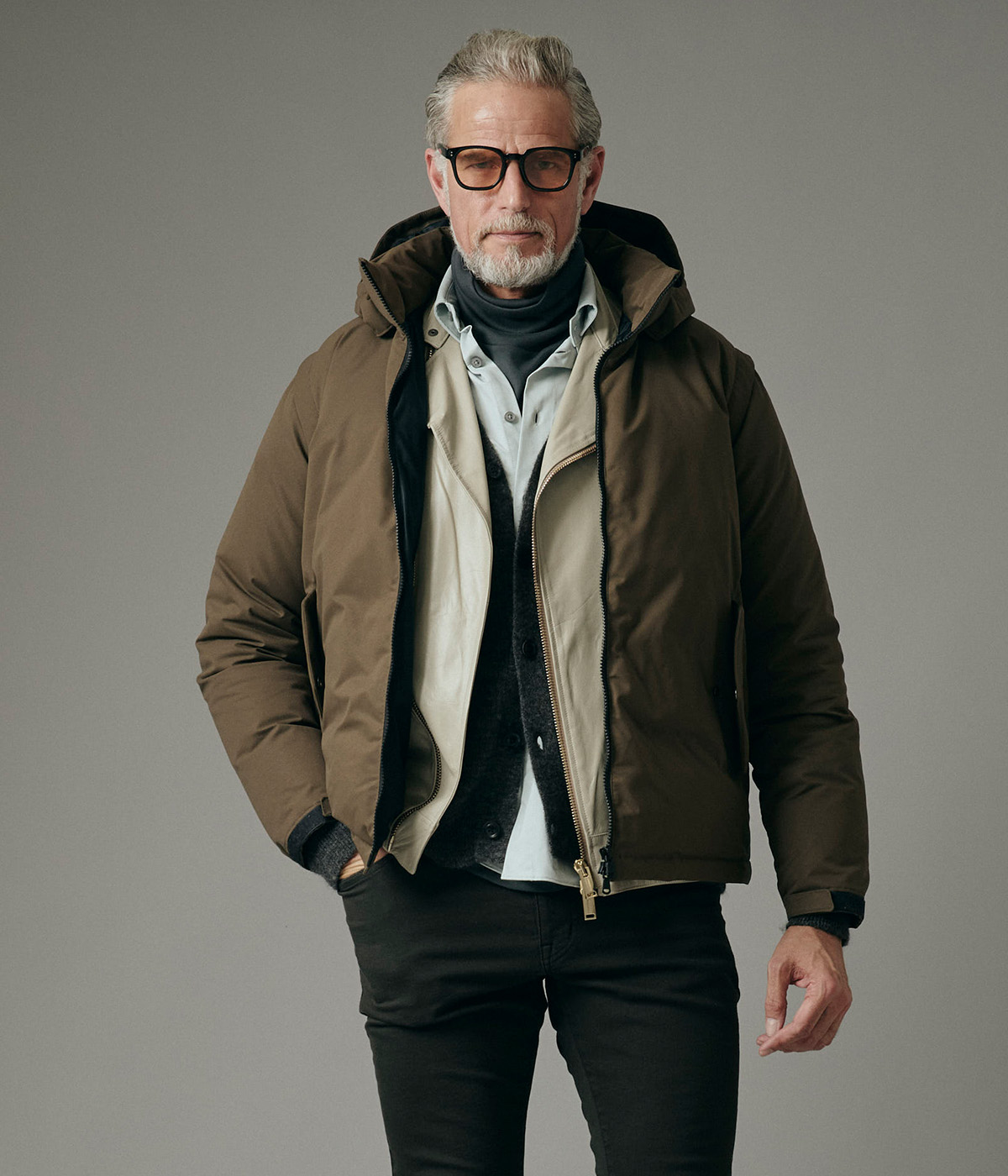 デザインは、スタンドカラーとダウン構造による防寒性を備えつつ、フードや袖を外すことでシーズンレスなスタイルに変化。