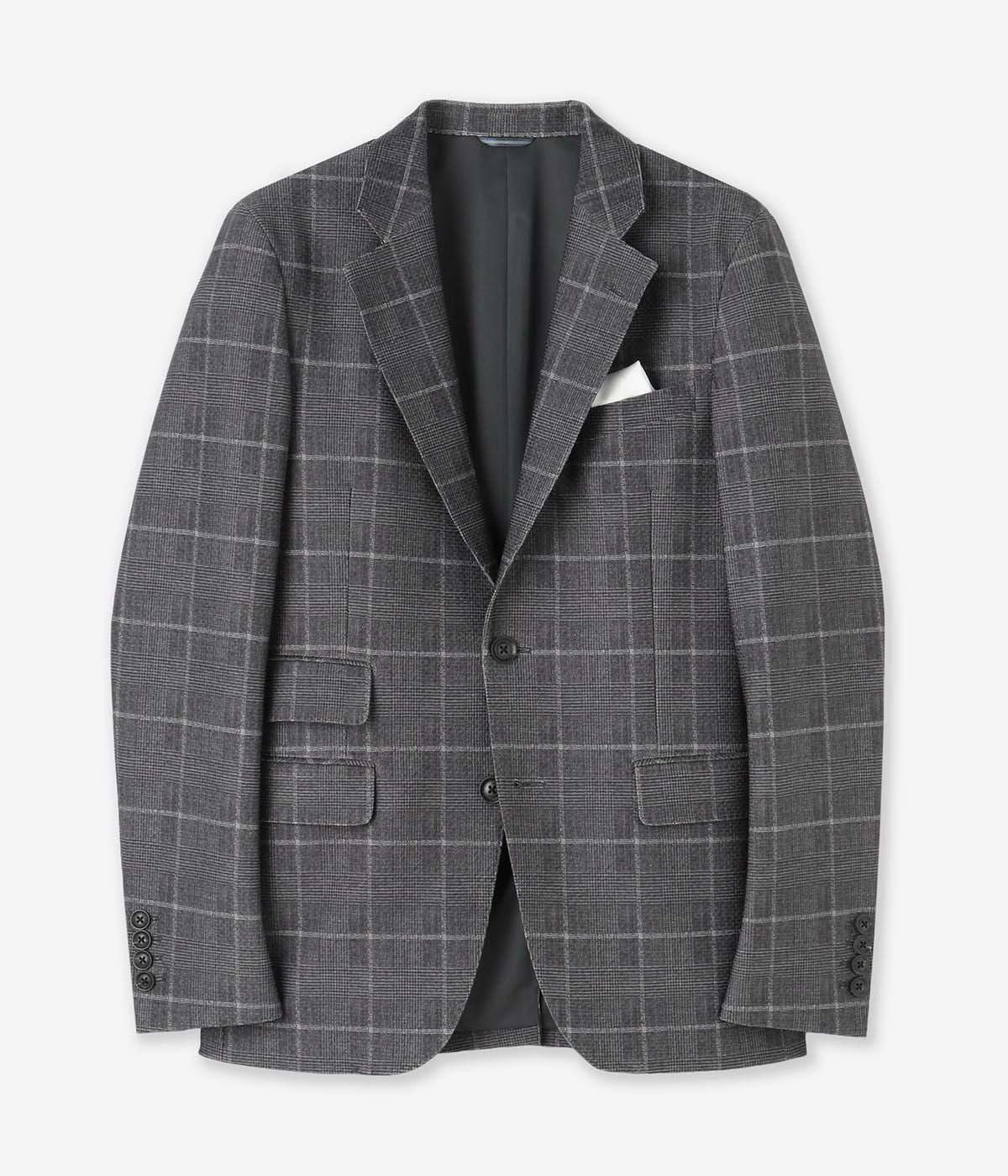 裾二釦、ノッチドラペル、袖口四釦、センターベント。junhashimotoの得意とする粋で男らしいジャケットです。