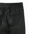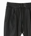 junhashimotoが得意とする美シルエットパンツがレザー調の素材で登場!レザーのように立体感のある独特な表情と深い色合い。さらにレザーには出せない縦横自由に伸縮するハイストレッチ性能。 股上はややゆったりめなシルエットで、膝下からテーパードをかけることでメリハリのある美シルエットに。