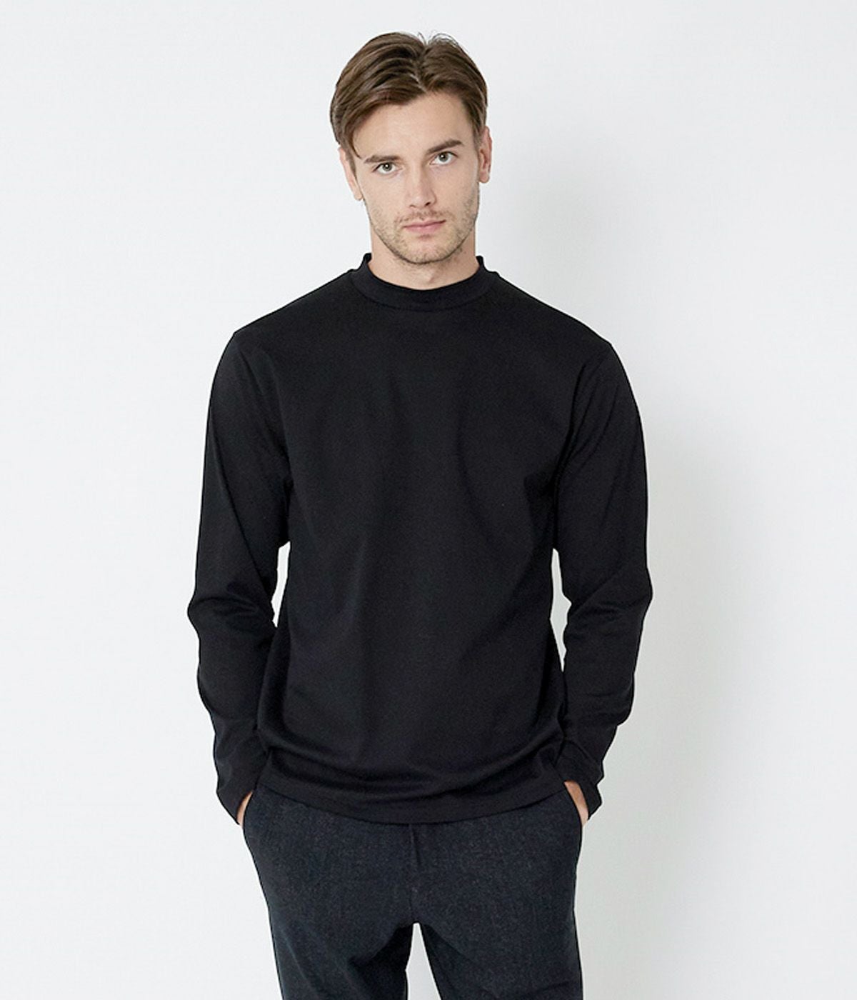 落ち着いた大人の色気を感じさせるモックネックスタイル。シンプルでセクシーな雰囲気であらゆるアウターとコーディネートをお楽しみいただけます。