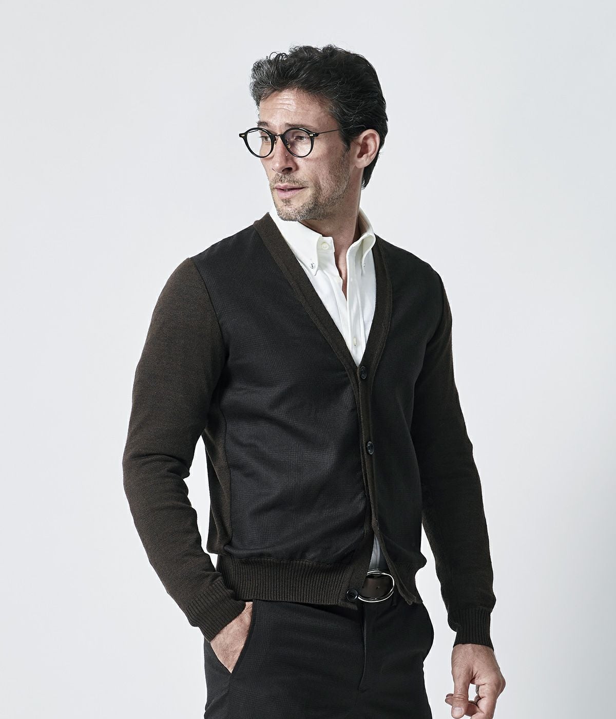 数多くの海外メゾンに生地を供給している尾州生地を使用し、上品なチェック柄のカーディガンを構築した。