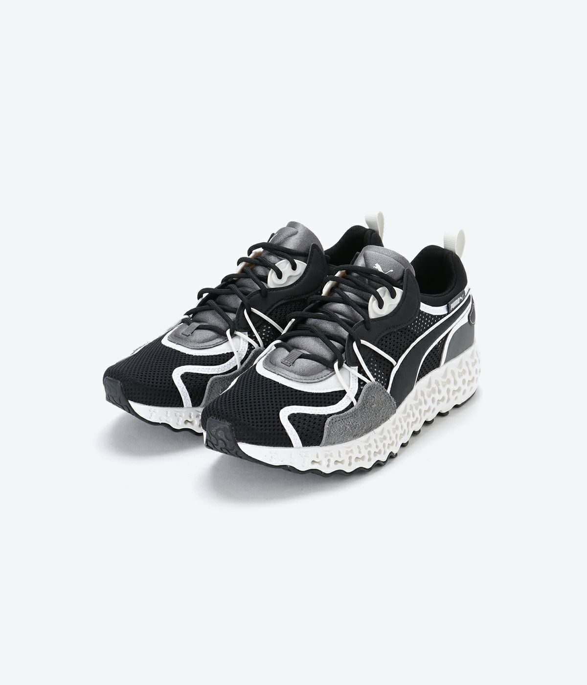 メカニカルなクッショニングとフォーム(発泡体)の組み合わせが歩行時の快適性を高め、最先端のテクノロジーをストリートでも履けるようにデザインされています。さまざまなランナーコミュニティの協力を得てランニング中に加わる力などの細かい動きを徹底的に分析。漸進的なクッショニングと反発性を提供する最適な構造形状を追求した結果、シューズの最大の特徴でもある、八の字型の空洞構造が生み出されました。