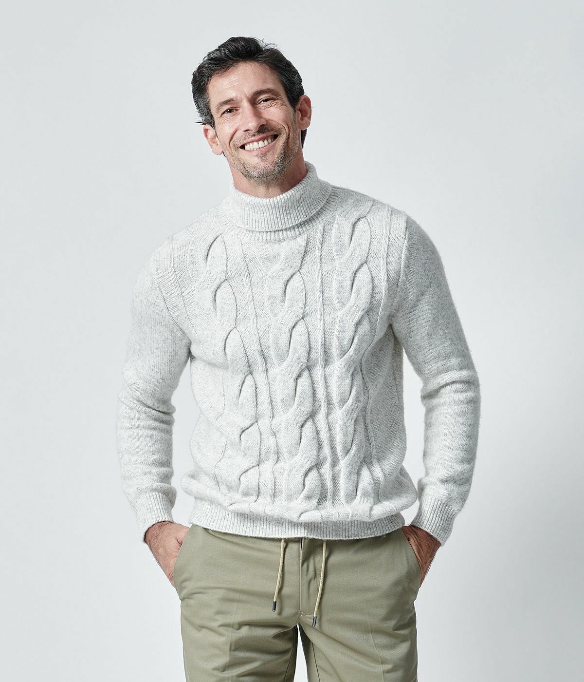 上品な表情と保温性抜群のケーブルタートルニット