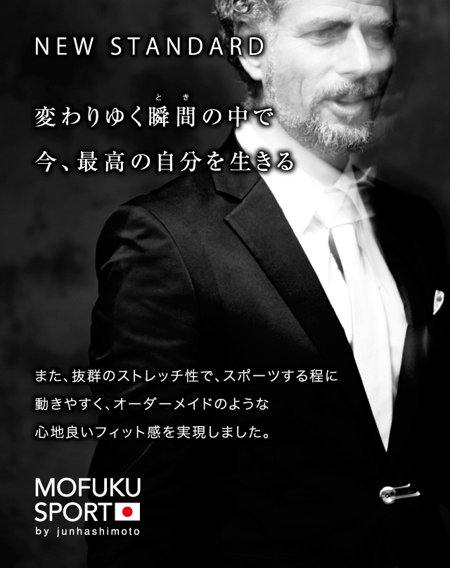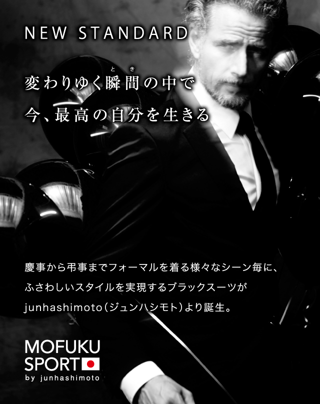 1  抜群のストレッチ性で、スポーツが出来るほどに動きやすい優れたストレッチ性で快適な着用感を提供するハイテクストレッチ素材「VIRTUAREX®(ヴァーチャレックス®)」を使用。通常の喪服に使われるウール素材と同様の高級感を持ちながら、軽量かつ快適な着心地を追求した「スーパー喪服」です。 2  シワになりにくく、防虫・防臭効果に優れているまた「VIRTUAREX®(ヴァーチャレックス®)」はシワになりにくく、コンパクトに畳めることで、遠方の式や出張時にも大変重宝します。また生地が丈夫で、速乾性、防虫・防臭効果にも優れています。 3  シャツ・ネクタイ・数珠など、必要な小物を全てご用意シャツ・ネクタイ・数珠など、礼服として必要な小物一式をご用意しました。また、ボタンやネクタイをリバーシブルにすることで、喪の席から祝いの席、ビジネスの場まで幅広く着用が可能。一着持っていると、様々なシーンで役立つ便利な喪服です。 4  体型が「+3cm」「-3kg」、シェイプ感のある美シルエットデザイナー橋本淳のデザインにより、身長が「+3cm」、体重が「-3kg」に見える、シャープで美しいシルエットを実現しました。タイトながらも生地がストレッチするので、窮屈な思いをすることもありません。高機能素材「VIRTUAREX®(ヴァーチャレックス®)」は従来のストレッチ素材よりも伸長回復性があります。デザイン性、機能性ともに一切の妥協を許さず、オーダーメイドのような究極のフィット感を追求しました。・	ジュンハシモトMOFUKU SPORT4点セット  119,800円・	セットアップ  89,800円	素材:VIRTUAREX®(ヴァーチャレックス®) ポリエステル100%・	シャツ  19,800円		素材:表地  コットン96%  ポリウレタン4%				         別布  コットン95%  ポリウレタン5%・	ネクタイ  8,980円		素材:絹100%・	数珠  8,980円		素材:黒オニキス、シルバー:ヘマタイト   ※全て税抜き表示 商品に関するお問い合せはこちら